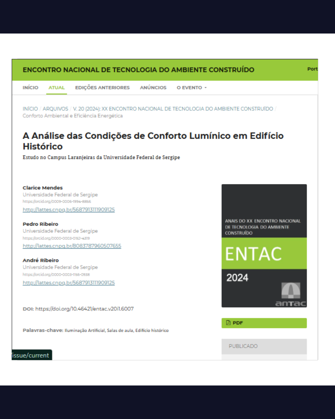 Para a adequação de edifícios históricos a novos usos, uma das soluções é o emprego de iluminação artificial, situação que pode ser observada nas salas de aula do Campus Laranjeiras (UFS), edifício do séc XIX, tombado em 1995. Nesse contexto, o objetivo deste artigo é avaliar as condições da iluminação artificial das salas de aula do CampusLar-UFS. Para tanto, foram realizadas medições in loco de iluminância em 817 células, bem como simulações computacionais no software DiaLux® para propor possíveis adequações e verificação das métricas melanóticas. Os resultados apontam que das treze salas de aula estudadas, quatro atenderam ao requisito normativo de iluminância, uma ao requisito de uniformidade, possivelmente pela quantidade insuficiente de luminárias, pé direito alto e do forro de madeira escura. As simulações apontaram que a mudança das lâmpadas, com fluxo luminoso e uma potência maior, e temperatura de cor neutra, resulta em um melhor desempenho dos ambientes.