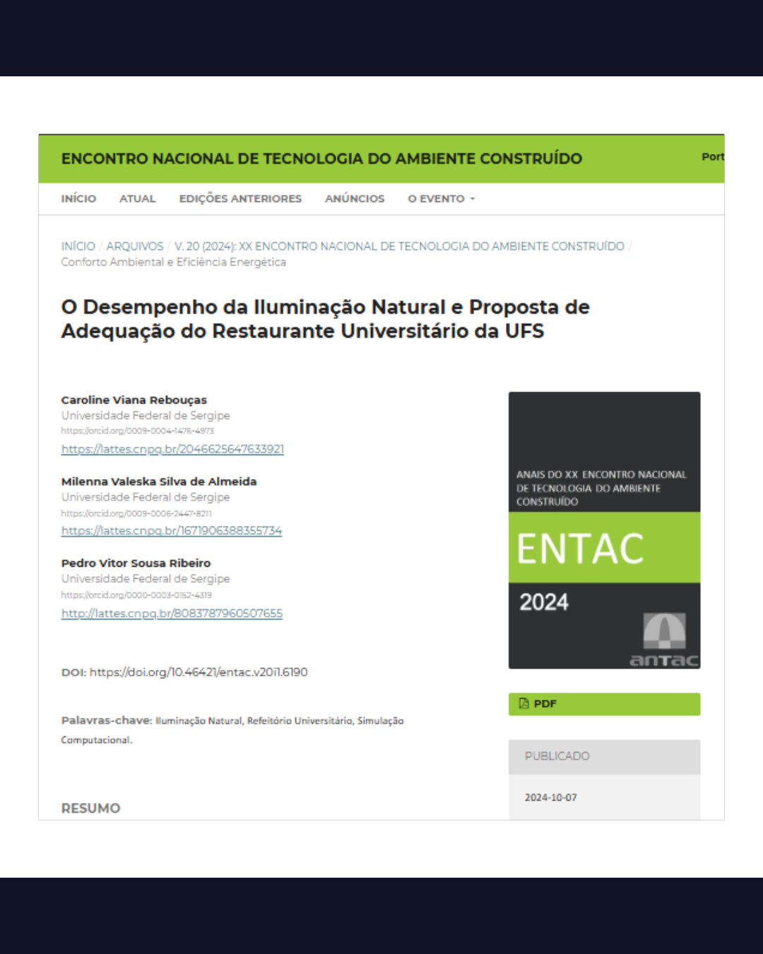 O uso de iluminação natural em restaurantes influência na experiência dos usuários, seu apetite e bem-estar. O estudo tem como objetivo avaliar o desempenho da iluminação natural no Restaurante Universitário da Universidade Federal de Sergipe- RESUN/UFS. A metodologia envolveu medições in loco de acordo com as normas NBR 15215, num total de 137 pontos, e simulações computacionais usando o software TropLux 8. Foram avaliadas as métricas de EMA, UMA, ALN, IULN e CS. Os resultados, pela análise das métricas do fator de luz do dia e sua uniformidade, revelaram altos valores de iluminância na região aberta do mezanino. Essa observação é atribuída à extensão das esquadrias desde o piso até o pavimento superior, provocando iluminação excessiva nessa área específica. Os resultados das simulações corroboram o comportamento das medições in loco. As proposições de protetores solares nas aberturas dos pavimentos superiores visaram adequar o edifício, construído em 1980, a fim de permitir que o ambiente atenda aos requisitos de norma.