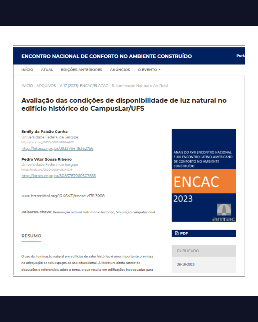 O uso da iluminação natural em edifícios de valor histórico é uma importante premissa na adequação de tais espaços ao uso educacional. A literatura ainda carece de discussões e referenciais sobre o tema, o que resulta em edificações inadequadas para uso educacional. O Campus de Laranjeiras, da Universidade Federal de Sergipe, se insere nesse contexto, ao estar sediada em um conjunto arquitetônico do século XVIII. O objetivo desse trabalho foi a avaliação das condições de iluminação natural das salas de aula do campus de Laranjeiras. Para tanto foram escolhidas três tipologias representativas. As salas foram simuladas computacionalmente usando o software Troplux. As métricas avaliadas foram a Iluminância média anual, Uniformidade média anual, Iluminância útil de luz natural e autonomia espacial da luz natural. Os resultados apontam que as pequenas dimensões das janelas inseridas nas paredes novas das edificações são insuficientes para a promoção da quantidade de luz natural nos ambientes. Em alguns casos, em que há suficiência, o fato de não haver proteção solar inviabiliza seu uso. As janelas originais, de grandes dimensões, tendem a promover muita luz para o ambiente interno, resultando em regiões muito iluminadas próximo à janela e escuras nas porções mais distantes. Conclui-se que o trabalho avalia um recorte da realidade do CampusLar, e que nesse sentido fomenta a discussão sobre a adequação de edifícios históricos para fins educacionais.