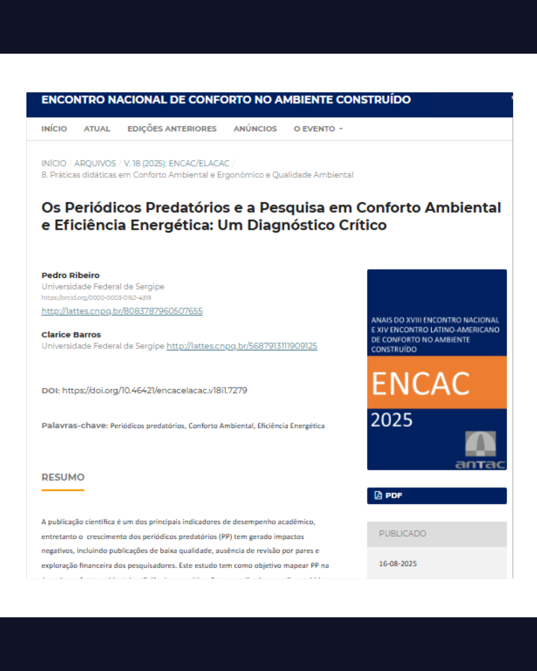 A publicação científica é um dos principais indicadores de desempenho acadêmico, entretanto o crescimento dos periódicos predatórios (PP) tem gerado impactos negativos, incluindo publicações de baixa qualidade, ausência de revisão por pares e exploração financeira dos pesquisadores. Este estudo tem como objetivo mapear PP na área de conforto ambiental e eficiência energética. Foram analisados e-mails recebidos por pesquisadores entre 2019 e 2025 e cruzadas informações com listas de periódicos já classificados como PP na literatura. Os resultados indicam um crescimento expressivo no número de e-mails recebidos, com um aumento significativo em 2024, além da presença de artigos da área em diversas revistas com práticas predatórias. O estudo reforça a necessidade de conscientização dos pesquisadores sobre as práticas predatórias e suas consequências para a ciência.